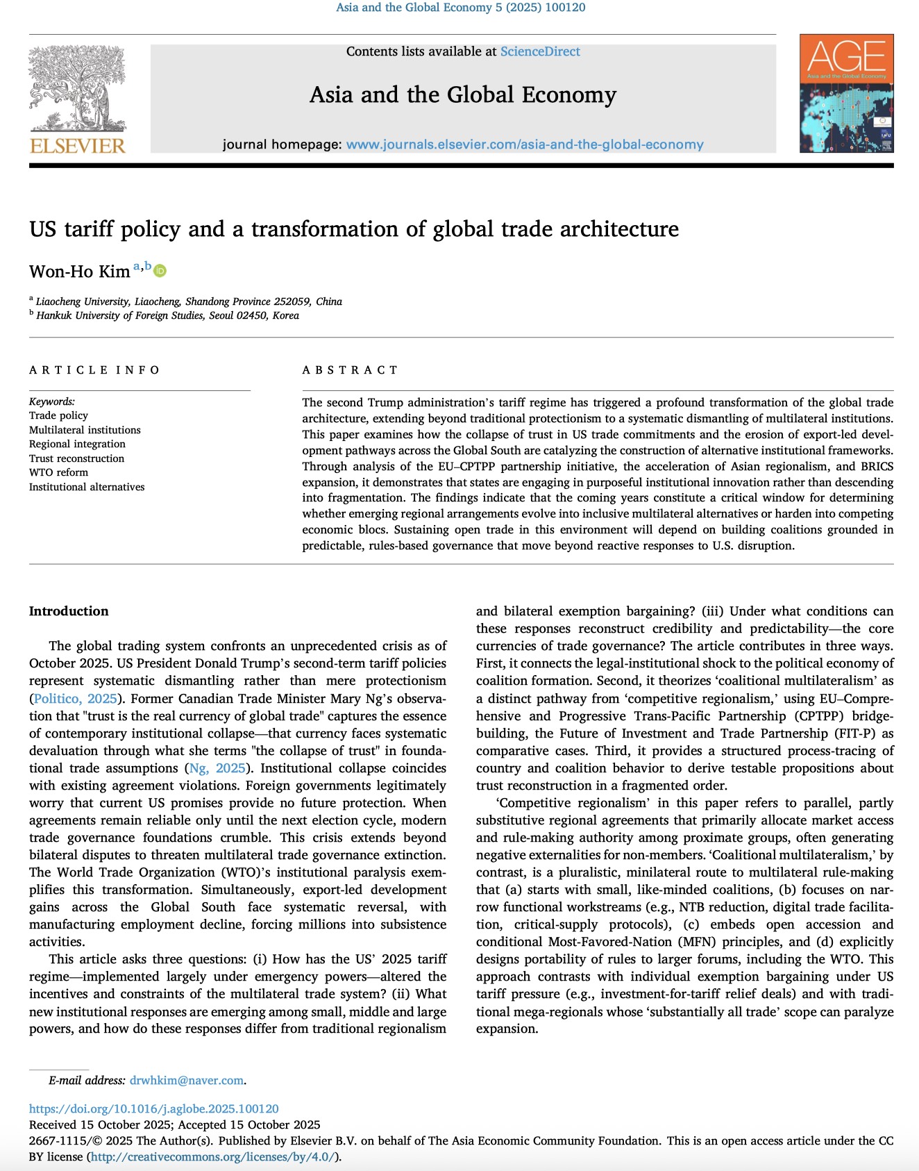 《美国关税政策与全球贸易架构的转型》(US Tariff Policy and a Transformation of Global Trade Architecture)一文主要论述特朗普政府第二任期实施的关税政策所引发全球贸易架构变革及其影响。该文探讨美国贸易承诺信任崩塌及全球南方国家出口导向型发展路径受侵蚀如何催生替代性制度框架的构建,分析欧盟-CPTPP伙伴关系倡议、亚洲区域主义加速以及金砖国家扩张,表明各国正在进行有目的的制度创新,而非陷入碎片化。金教授认为,美国关税政策所引发的全球贸易架构的转型已经超越传统的保护主义范畴,并演变为多边机构的系统性瓦解。